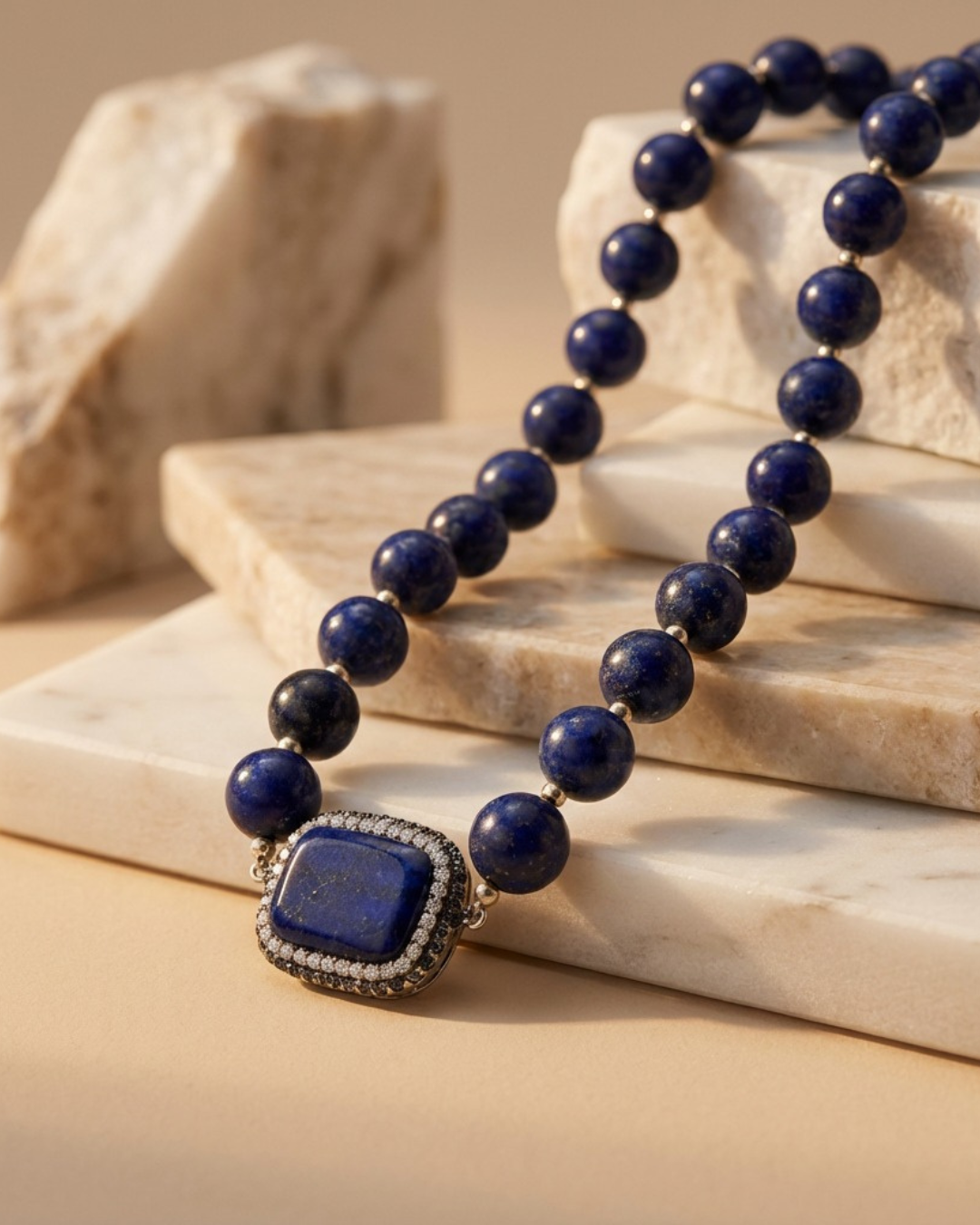 Collar de piedras semi preciosas Lapizlazuli con dije de goldfilled, agata y zircones en micropave, ideal para resaltar tu estilo con actitud y presencia. Perfecto para combinar en capas.