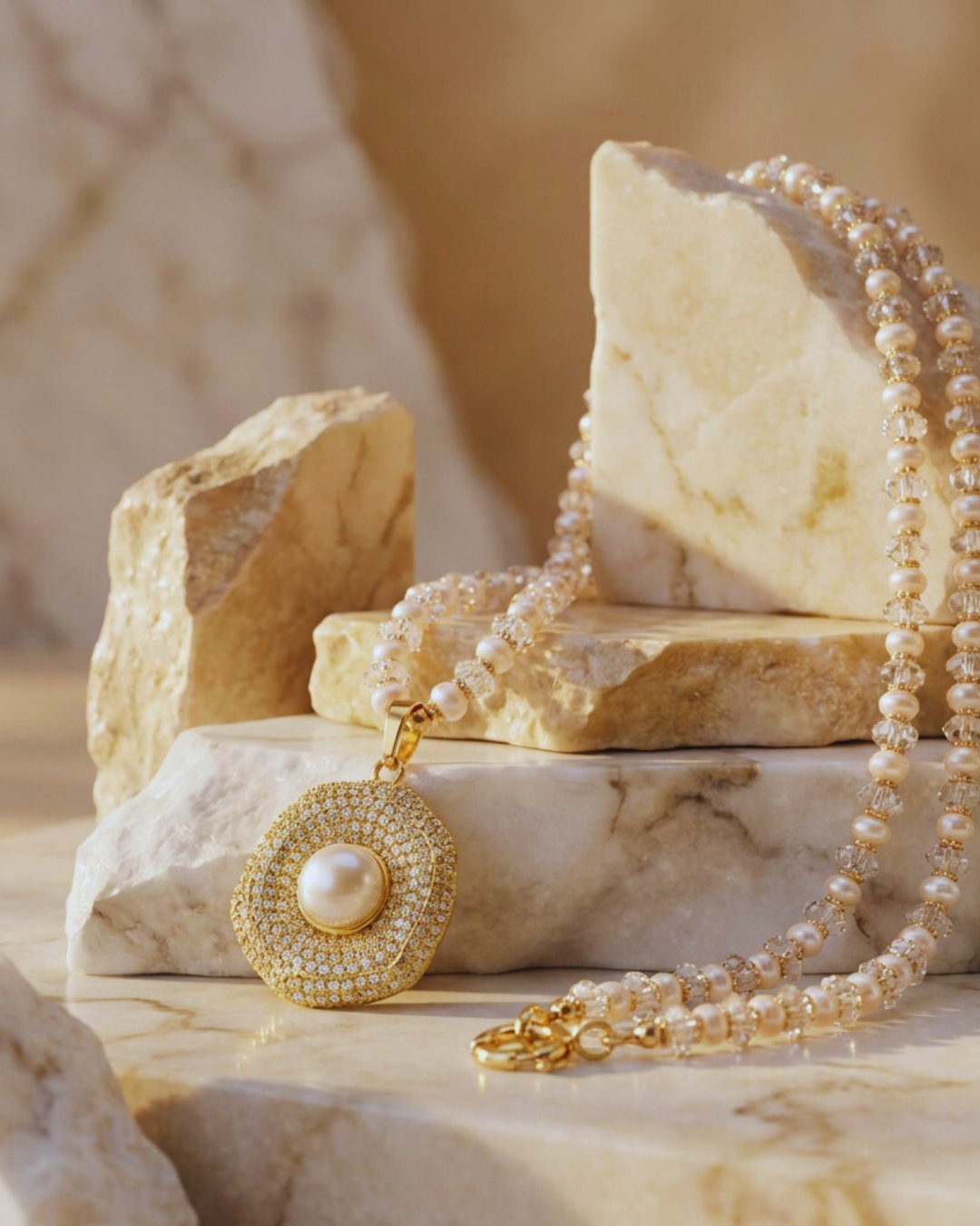 Collar largo de perlas naturales con cristales y dije flor con centro de perla de gollfilled e incrustaciones de zircones.