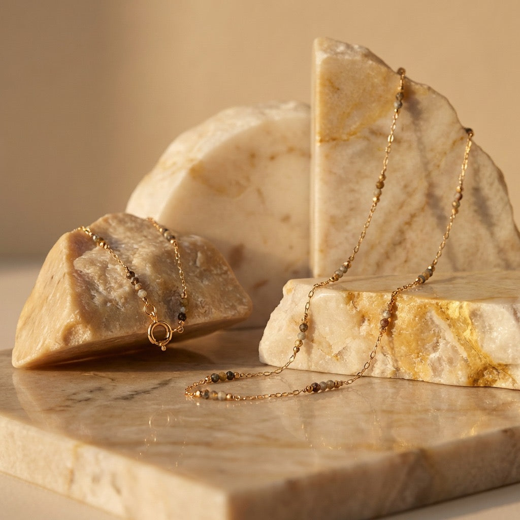 Fina cadena larga de goldfilled y agatas. Ideal para combinar en layering, lo puedes usar en 2 o 3 capas.
