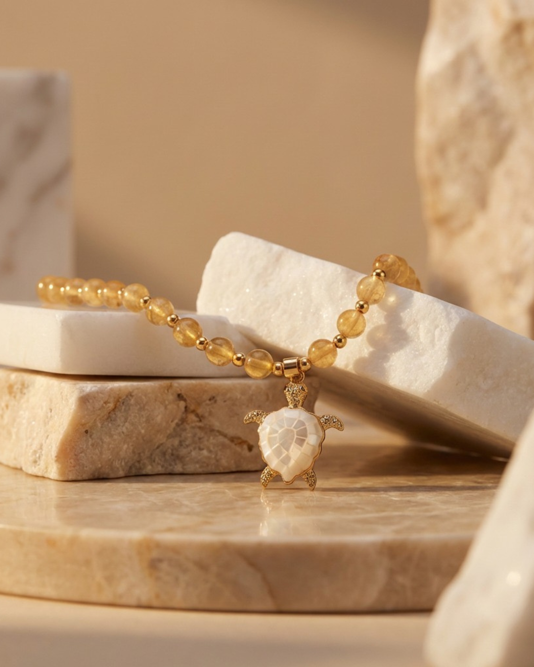 Collar de piedras semi preciosas con dije de tortuga con incrustaciones de zircones y nacar ideal para resaltar tu estilo con actitud y presencia. Perfecto para combinar en capas.