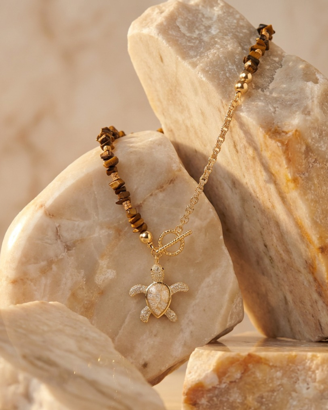 Collar de piedra picada de ojo de gato, cadena de goldfilled y dije de tortuga con incrustaciones de zircones y nacar. Perfecta para layering.